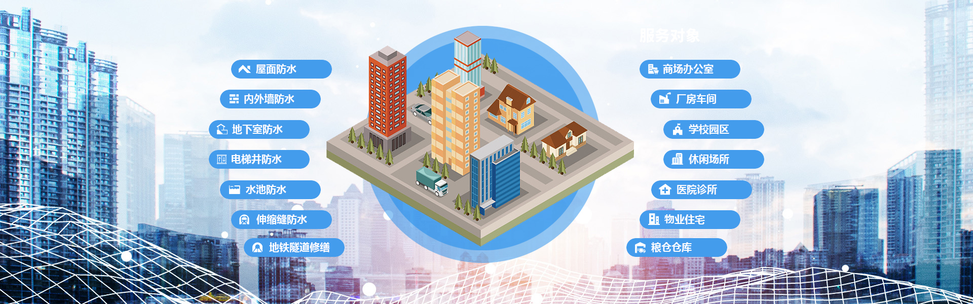 桥禹建筑装饰防水公司提供的服务涵盖了房屋、厨房、卫生间、地下室、户外、屋面等多种防水补漏场景,能够满足不同客户的需求。